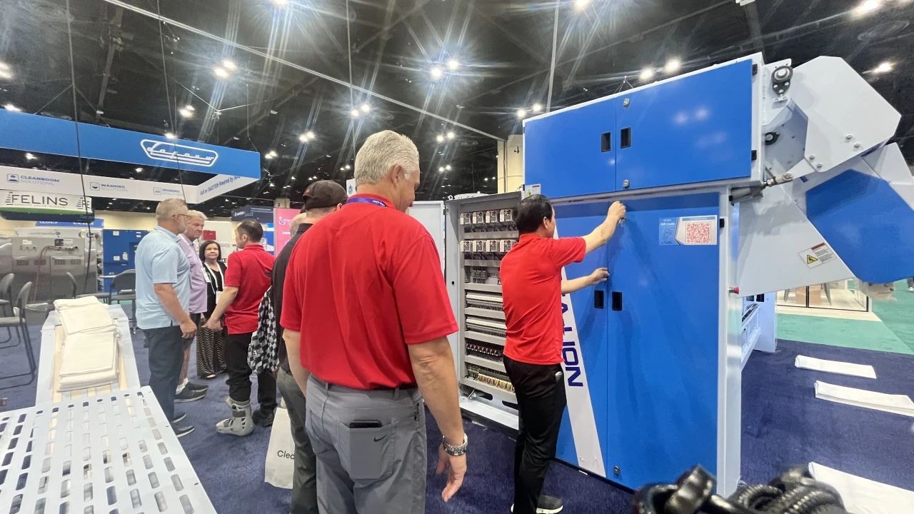 “Titanium”鈦系列洗脫機(jī)與烘干機(jī),聚焦高效洗滌與節(jié)能降耗雙重優(yōu)勢(shì)。通過精準(zhǔn)控溫、智能水循環(huán)系統(tǒng)及變頻電機(jī)技術(shù),實(shí)現(xiàn)單位時(shí)間內(nèi)更高洗滌量和烘干量的同時(shí),大幅降低水、電、蒸汽消耗,為用戶帶來經(jīng)濟(jì)與環(huán)保兼具的卓越體驗(yàn) 參展人士對(duì)這一系列設(shè)備表現(xiàn)出了濃厚興趣,在現(xiàn)場(chǎng)海獅人員的詳細(xì)操作講解下,他們對(duì)中國(guó)制造的研發(fā)制造實(shí)力有了更深刻的認(rèn)識(shí),紛紛為海獅機(jī)械的創(chuàng)新能力點(diǎn)贊。