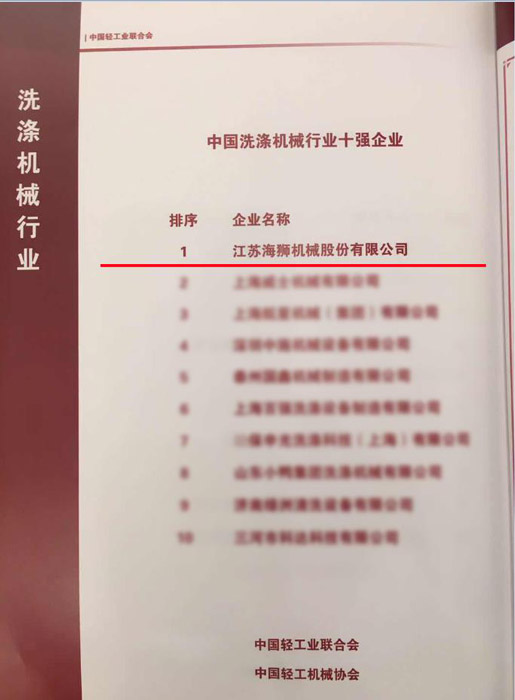 Today,Jiangsu Sea-lion Machinery Co.,Ltd has the honor to win The first place of China washing machinery industry top ten  The eighth of Chinese light industrial equipment manufacturing industry top 30 enterprises  The 23th of Chinese top 100 light industrial technology companies