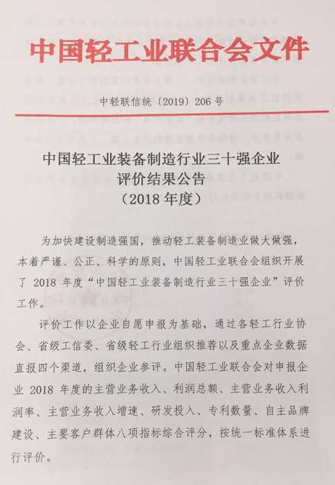 In order to accelerate the strong country construction and promote the development of the light industrial equipment manufacturing industry ,in the principle of preciseness, fairness and science ,the China light industry federation has organized the evaluation of “top 30 enterprises in Chinese light industrial equipment manufacturing industry” and “top 100 enterprises in Chinese light industrial technology industry” in 2018 .